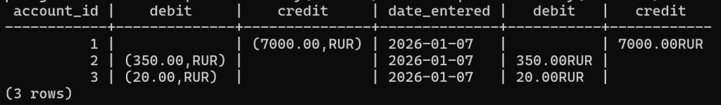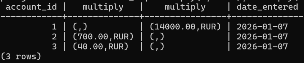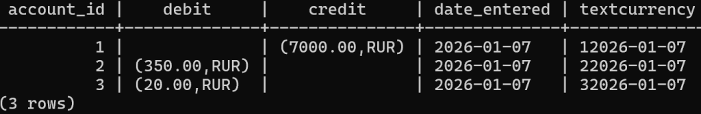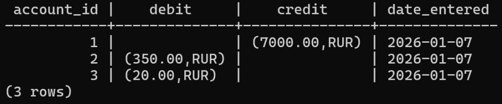 INSERT INTO transactions VALUES(3, (20.00,'RUR'), NULL);